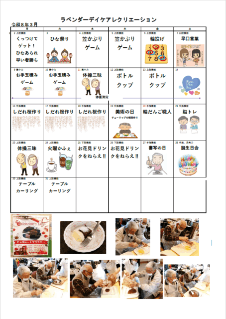 通所リハビリテーション「ラベンダーデイケアレクリエーション」3月の予定を掲載しました。